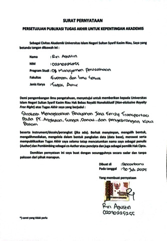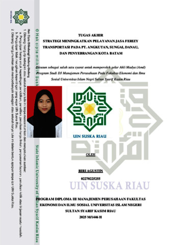 RIRI AGUSTIN, - (2025) STRATEGI MENINGKATKAN PELAYANAN JASA FERIZY TRANSPORTASI PADA PT. ANGKUTAN, SUNGAI, DANAU, DAN PENYEBRANGAN KOTA BATAM. Skripsi thesis, Universitas Islam Negeri Sultan Syarif Kasim Riau.