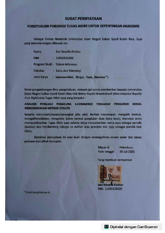 SARI NOVELLA ELSZHUR, - (2025) ANALISIS PERILAKU PENGGUNA E-COMMERCE TERHADAP PENGARUH SOSIAL MENGGUNAKAN METODE UTAUT2. Skripsi thesis, Universitas Islam Negeri Sultan Syarif Kasim Riau.