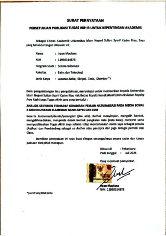 IRPAN MAULANA, - (2025) ANALISIS SENTIMEN TERHADAP KEHADIRAN PEMAIN NATURALISASI PADA MEDIA SOSIAL X MENGGUNAKAN KLASIFIKASI NAIVE BAYES DAN SVM. Skripsi thesis, Universitas Islam Negeri Sultan Syarif Kasim Riau.