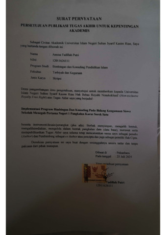ANNISA FADILLAH PUTRI, - (2025) IMPLEMENTASI PROGRAM BIMBINGAN DAN KONSELING PADA BIDANG KEAGAMAAN SISWA SEKOLAH MENEGAH PERTAMA NEGERI 1 PANGKALAN KURAS SOREK SATU. Skripsi thesis, Universitas Islam Negeri Sultan Syarif Kasim Riau.