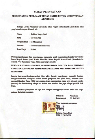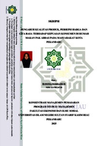 ROHIMA NUGRA HENI, - (2025) PENGARUH KUALITAS PRODUK, PERSEPSI HARGA DAN CITA RASA TERHADAP KEPUASAN KONSUMEN DI RUMAH MAKAN PAK ABBAS PADA MASYARAKAT KOTA PEKANBARU. Skripsi thesis, Universitas Islam Negeri Sultan Syarif Kasim Riau.