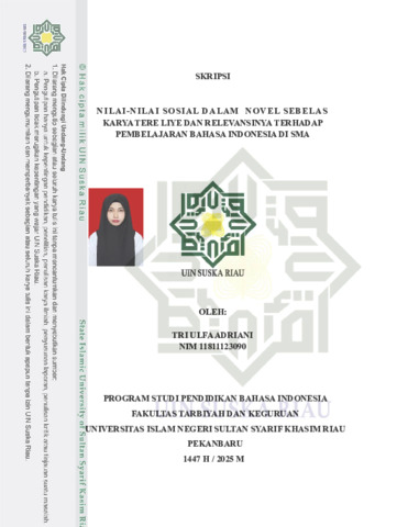 Tri Ulfa Adriani, - (2025) N I L A I - N I L A I S O S I A L D A L A M N O V E L S E B E L A S KARYA TERE LIYE DAN RELEVANSINYA TERHADAP PEMBELAJARAN BAHASA INDONESIA DI SMA. Skripsi thesis, UNIVERSITAS ISLAM NEGERI SULTAN SYARIF KASIM RIAU.