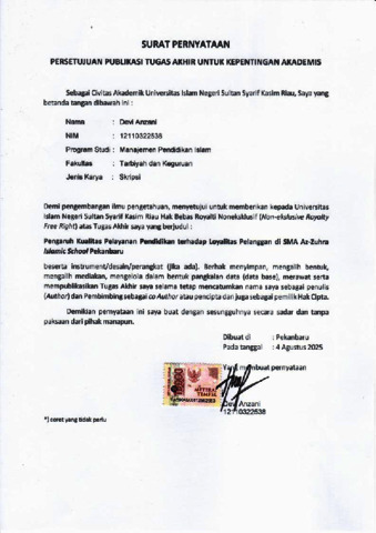 DEVI ANZANI, - (2025) PENGARUH KUALITAS PELAYANAN PENDIDIKAN TERHADAP LOYALITAS PELANGGAN DI SMA AZ-ZUHRA ISLAMIC SCHOOL PEKANBARU. Skripsi thesis, UIN SUSKA.