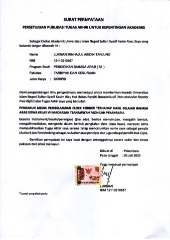 LUKMAN MINHAJUL ABIDIN TANJUNG, - (2025) PENGARUH MEDIA PEMBELAJARAN CLOCK CORNER TERHADAP HASIL BELAJAR SISWA KELAS VII MADRASAH TSANAWIYAH FADHILAH PEKANBARU. Skripsi thesis, UIN SUSKA.