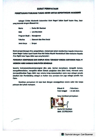 DWITA GIRI GUSTIANI, - (2025) PENGARUH KOMPENSASI DAN DISIPLIN KERJA TERHADAP KINERJA KARYAWAN PADA PT MESKOM AGRO SARIMAS KABUPATEN BENGKALIS. Skripsi thesis, UNIVERSITAS ISLAM NEGERI SULTAN SYARIF KASIM RIAU.