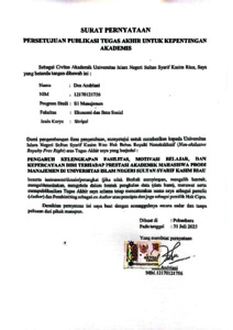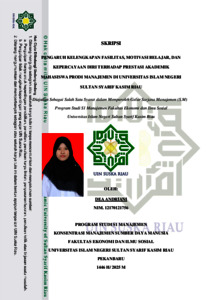 ABSTRAK Pengaruh Kelengkapan Fasilitas, Motivasi Belajar, Dan Kepercayaan Diri Terhadap Prestasi Akademik Mahasiswa Prodi Manajemen Di Universitas Islam Negeri Sultan Syarif Kasim Riau Oleh Dea Andriani 12170121756 Penelitian ini bertujuan untuk menganalisis pengaruh kelengkapan fasilitas, motivasi belajar, dan kepercayaan diri terhadap prestasi akademik mahasiswa prodi manajemen di Universitas Islam Negeri Sultan Syarif Kasim Riau. Metode penelitian yang digunakan adalah kuantitatif melalui pendekatan deskriptif dengan jumlah sampel 120 responden yang dipilih melalui teknik proportionate stratified random sampling. Data dikumpulkan menggunakan penyebaran kuesioner online melalui Google Form. Analisis data dilakukan dengan menggunakan software Smart PLS versi 4.0. Hasil analisis menunjukkan bahwa motivasi belajar dan kepercayaan diri berpengaruh positif dan signifikan terhadap prestasi akademik mahasiswa prodi manajemen berdasarkan pada uji hipotesis didapatkan nilai p-value pada motivasi belajar dan kepercayaan diri adalah 0,000 < 0,05 yang artinya hipotesis diterima.. Sedangkan kelengkapan fasilitas tidak berpengaruh secara positif dan signifikan karena nilai p-values adalah 0,136 > 0,05 yang artinya hipotesis ditolak. Dan nilai R-square pada prestasi akademik sebesar 0,656, artinya kelengkapan fasilitas, motivasi belajar dan kepercayaan diri berpengaruh terhadap prestasi akademik secara moderat (sedang). Kata Kunci: Kelengkapan Fasilitas, Motivasi Belajar, Kepercayaan Diri, Dan Prestasi Akademik.
