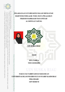 ABSTRAK Sita Nabila, (2025) : Pelaksanaan Ice breaking dalam Mengatasi Kejenuhan Belajar pada Mata Pelajaran Fikih di Madrasah Tsanawiyah Al-Imtiyaz Tapung Penelitian ini bertujuan untuk mendeskripsikan pelaksanaan Ice breaking dalam mengatasi kejenuhan belajar pada mata pelajaran Fikih di Madrasah Tsanawiyah Al-Imtiyaz Tapung. Jenis penelitian ini adalah penelitian deskriptif kualitatif. Informan utama dalam penelitian ini 1 Guru Fikih dan informan pendukung Kepala Sekolah,Waka Kesiswaan dan 4 orang siswa. Teknik pengumpulan data menggunakan observasi, wawancara dan dokumentasi. Hasil Penelitian menunjukkan bahwa pelaksanaan ice breaking dalam mengatasi kejenuhan belajar pada mata pelajaran Fikih yaitu, pelaksanaan ice breaking dilakukan secara spontan dan terencana oleh guru Fikih. Ice breaking spontan diterapkan saat siswa menunjukkan kejenuhan, sedangkan ice breaking terencana dicantumkan dalam modul ajar dan disesuaikan dengan materi pembelajaran. Teknik ice breaking yang digunakan meliputi tepuk tangan, yel-yel, nyanyian, dan gerakan tubuh, yang terbukti efektif dalam menarik perhatian siswa dan menciptakan suasana kelas yang menyenangkan. Ice breaking juga berdampak positif dalam mengatasi kejenuhan belajar, meningkatkan semangat, konsentrasi, dan partisipasi siswa, terutama pada jam-jam pembelajaran yang rawan kejenuhan seperti siang hari. Kata Kunci: Ice breaking, Kejenuhan Belajar