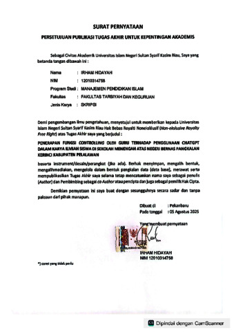 IRHAM HIDAYAH, - (2025) PENERAPAN FUNGSI CONTROLLING OLEH GURU TERHADAP PENGGUNAAN CHATGPT DALAM KARYA ILMIAH SISWA DI SEKOLAH MENENGAH ATAS NEGERI BERNAS PANGKALAN KERINCI KABUPATEN PELALAWAN. Skripsi thesis, UNIVERSITAS ISLAM NEGERI SULTAN SYARIF KASIM RIAU.
