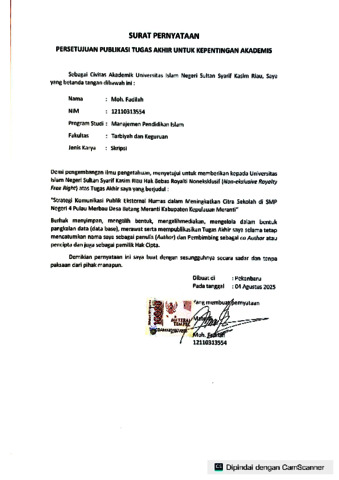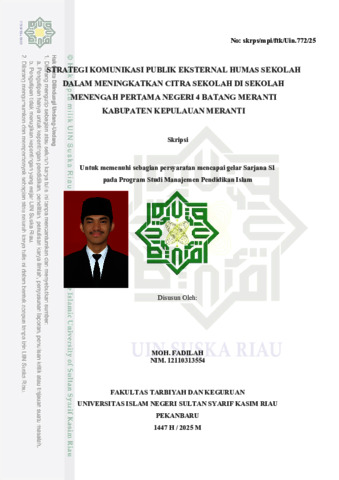 ABSTRAK Moh. Fadilah, (2025): Strategi Komunikasi Publik Eksternal Humas dalam Meningkatkan Citra Sekolah di SMP Negeri 4 Pulau Merbau Desa Batang Meranti Kabupaten Kepulauan Meranti Penelitian ini bertujuan untuk mengetahui: 1) Strategi komunikasi publik eksternal yang dilakukan oleh humas SMP Negeri 4 Batang Meranti. 2) Media komunikasi yang dimanfaatkan Humas dalam menjalin hubungan dengan masyarakat dan wali murid. 3) Dampak strategi komunikasi publik eksternal Humas terhadap citra sekolah di mata masyarakat dan wali murid. Jenis penelitian ini adalah deskriptif kualitatif. Informan penelitian 1 orang Humas, 1 orang Kepala Sekolah, 1 orang Masyarakat dan 1 orang Wali Murid. Teknik pengumpulan data menggunakan pedoman wawancara dan dokumentasi. Teknik analisis data menggunakan reduksi data, penampilan data dan kesimpulan data. Hasil penelitian menunjukkan bahwa 1) Strategi komunikasi publik eksternal yang diterapkan: a) Humas berperan sebagai penghubung sekolah dengan pihak luar dan menyampaikan informasi penting, menangani tamu, dan mempublikasikan kegiatan sekolah. b) Menjalin kerja sama dengan lembaga luar seperti puskesmas dan kepolisian. c) Menentukan sasaran komunikasi, yaitu orang tua, masyarakat sekitar, tokoh masyarakat, dan instansi pemerintah. 2) Media komunikasi yang dimanfaatkan: a) Menggunakan berbagai media seperti WhatsApp, Facebook sekolah, surat undangan dan pertemuan langsung. b) Komunikasi dilakukan secara rutin, minimal satu kali seminggu. c) Efektivitas media masih terbatas karena tidak semua orang tua aktif mengakses informasi. 3) Dampak strategi komunikasi publik eksternal: a) Pandangan masyarakat terhadap sekolah semakin positif karena dinilai terbuka dan aktif. b) Kepercayaan orang tua meningkat karena mereka lebih terlibat dan mendapatkan informasi secara teratur. Kata Kunci: Strategi Komunikasi, Humas Sekolah dan Citra Sekolah