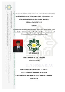 Penelitian ini bertujuan untuk mengevaluasi pemberdayaan ekonomi masyarakat melalui Program Desa Maju Indragiri Hilir Jaya (DMIJ) Plus Terintegrasi di Desa Kotabaru Seberida, Kecamatan Keritang. Program ini merupakan inisiatif Pemerintah Kabupaten Indragiri Hilir yang lebih berfokus pada peningkatan kualitas masyarakat desa melalui pemberdayaan ekonomi, untuk menciptakan kesejahteraan dan peningkatan ekonomi masyarakat, serta pengelolaan pembangunan dengan prinsip pemberdayaan. Penelitian ini menggunakan metode kualitatif dengan pendekatan deskriptif. Sumber data yang diperoleh berupa data primer dan data sekunder. Instrumen dari penelitian ini adalah observasi, wawancara dan dokumentasi. Hasil penelitian menunjukkan bahwa program ini berhasil memberdayakan ekonomi masyarakat dan memberikan dampak positif terhadap usaha perekonomian masyarakat, meskipun belum sepenuhnya optimal dan merata di seluruh lapisan masyarakat desa. Adapun faktor-faktor yang menjadi penghambat pemberdayaan ekonomi masyarakat, seperti rendahnya kualitas SDM, infrastruktur yang belum memadai, dan keterbatasan anggaran desa. Kata Kunci : Pemberdayaan Ekonomi, DMIJ, Evaluasi CIPP