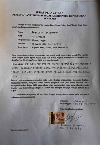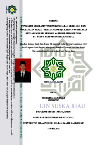 ASYROFUL MUNAWAR, - (2025) PENGARUH KESELAMATAN DAN KESEHATAN KERJA (K3) DAN LINGKUNGAN KERJA TERHADAP KINERJA KARYAWAN MELALUI KEPUASAN KERJA SEBAGAI VARIABEL MEDIASI PADA PT. SUBUR BARU MADANI ROKAN HULU. Skripsi thesis, UNIVERSITAS ISLAM NEGERI SULTAN SYARIF KASIM RIAU.