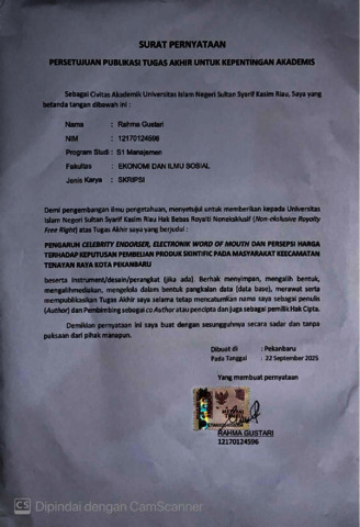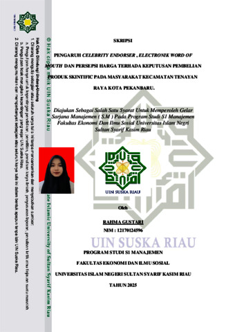 RAHMA GUSTARI, - (2025) PENGARUH CELEBRITY ENDORSER,ELECTRONIK WORD OF MOUTH DAN PERSEPSI HARGA TERHADAP KEPUTUASAN PEMBELIAN PRODUK SKINTIFIC PADA MASYARAKAT KECAMATAN TENAYAN RAYA KOTA PEKANBARU. Skripsi thesis, Universitas Islam Negeri Sultan Syarif Kasim Riau.