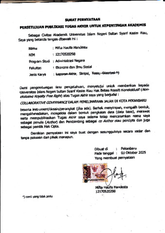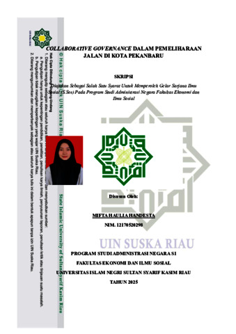 MIFTA HAULIA HANDESTA, - (2025) COLLABORATIVE GOVERNANCE DALAM PEMELIHARAAN JALAN DI KOTA PEKANBARU. Skripsi thesis, Universitas Islam Negeri Sultan Syarif Kasim Riau.