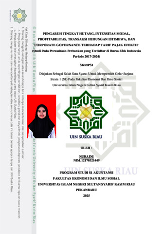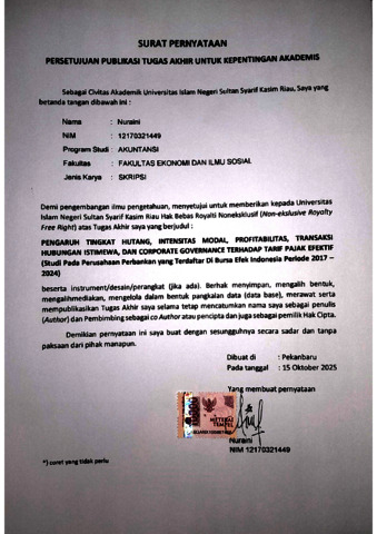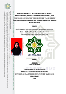 NURAINI, - (2025) PENGARUH TINGKAT HUTANG, INTENSITAS MODAL, PROFITABILITAS, TRANSAKSI HUBUNGAN ISTIMEWA, DAN CORPORATE GOVERNANCE TERHADAP TARIF PAJAK EFEKTIF (STUDI PADA PERUSAHAAN PERBANKAN YANG TERDAFTAR DI BURSA EFEK INDONESIA PERIODE 2017-2024). Skripsi thesis, Universitas Islam Negeri Sultan Syarif Kasim Riau.