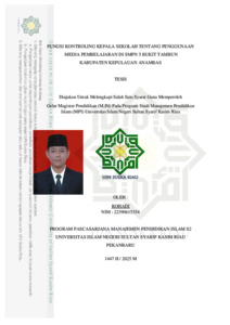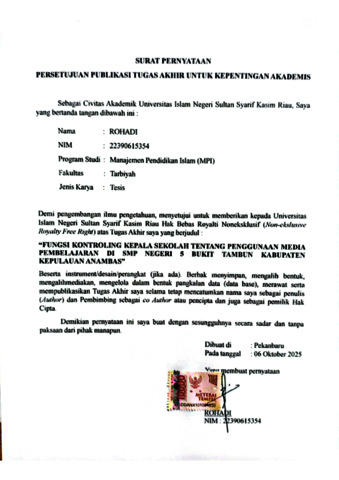 ABSTRAK ROHADI, 2025 : Fungsi Kontroling Kepala Sekolah Tentang Penggunaan Media Pembelajaran Di SMPN 5 BUKIT TAMBUN Kabupaten Kepulauan Aanambas Penelitian ini bertujuan untuk menganalisa fungsi kontroling kepala sekolah tentang penggunaan media pembelajaran di SMPN 5 Bukit Tambun Kabupaten Kepulauan Anambas. Jenis penelitian yang digunakan adalah kualitatif. Teknik pengumpulan data dengan observasi, wawancara, dokumentasi. Teknik analisa data terdiri dari reduksi data, penyajian data, verifikasi, penarikan kesimpulan serta triagulasi. Hasil penelitian menunjukkan bahwa : 1) . Fungsi kontroling kepala sekolah dalam penggunaan media pembelajaran di SMPN 5 Bukit Tambun dilakukan melalui pengawasan berkala, evaluasi efektivitas media, serta pemberian umpan balik kepada guru untuk memastikan kesesuaian dengan kurikulum dan kebutuhan siswa, sekaligus mendorong inovasi pengajaran, 2) kendala yang dihadapi oleh kepala sekolah dalam menjalankan fungsi kontroling di antaranya adalah keterbatasan fasilitas teknologi, kurangnya pelatihan guru, kendala jaringan internet, dan minimnya anggaran untuk media modern. Untuk mengatasi tantangan tersebut dan meningkatkan efektivitas penggunaan media pembelajaran, kepala sekolah menerapkan berbagai strategi seperti pelatihan guru, pemanfaatan media lokal, kerja sama dengan pihak eksternal, serta monitoring dan evaluasi berkelanjutan berbasis umpan balik. Kata kunci : Fungsi Kontroling, Kepala Sekolah, Media Pembelajaran
