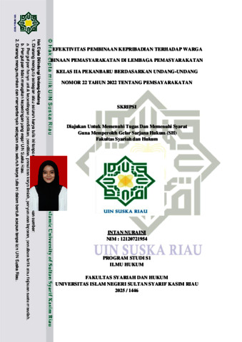 INTAN NURAINI, - (2025) EFEKTIVITAS PEMBINAAN KEPRIBADIAN TERHADAP WARGA BINAAN PEMASYARAKATAN DI LEMBAGA PEMASYARAKATAN KELAS IIA PEKANBARU BERDASARKAN UNDANG-UNDANG NOMOR 22 TAHUN 2022 TENTANG PEMASYARAKATAN. Skripsi thesis, Universitas Islam Negeri Sultan Syarif Kasim Riau.