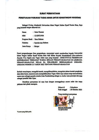 Surat pernyataan publikasi - INTAN NURAINI Ilmu Hukum S1.pdf - Published Version Download (549kB) | Preview |