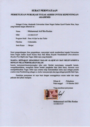MUHAMMAD ARIF BIN ROSLAN, - (2025) MAKNA MITSAQAN GHALIDZAN DALAM AL-QUR’AN DAN RELEVANSINYA DENGAN NILAI PERNIKAHAN ISLAM. Skripsi thesis, Universitas Islam Negeri Sultan Syarif Kasim Riau.