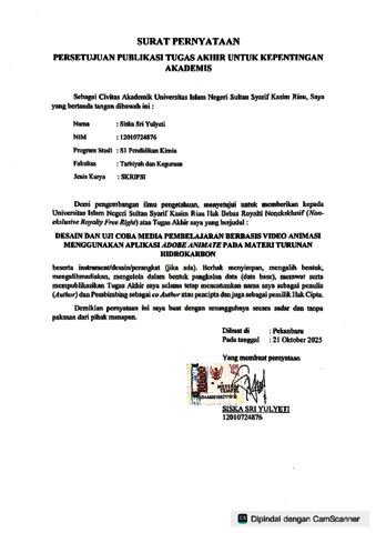 SISKA SRI YULYETI, - (2025) DESAIN DAN UJI COBA MEDIA PEMBELAJARAN BERBASIS VIDEO ANIMASI MENGGUNAKAN APLIKASI ADOBE ANIMATE PADA MATERI TURUNAN HIDROKARBON. Skripsi thesis, Universitas Islam Negeri Sultan Syarif Kasim Riau.