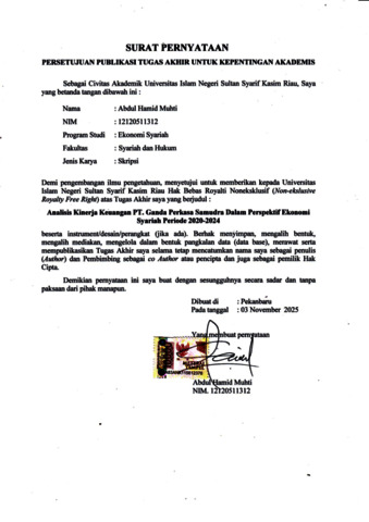 ABDUL HAMID MUHTI, - (2025) ANALISIS KINERJA KEUANGAN PT. GANDA PERKASA SAMUDRA DALAM PERSPEKTIF EKONOMI SYARIAH PERIODE 2020-2024. Skripsi thesis, UNIVERSITAS ISLAM NEGRI SULTAN SYARIF KASIM RIAU.