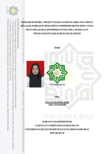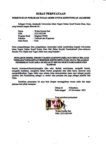 ABSTRAK Wulan Kurnia Sari (2025): Pengaruh Model Project Based Learning (PjBL) dan Minat Belajar terhadap Kemampuan Berpikir Kritis Siswa pada Mata Pelajaran Pendidikan Pancasila di Kelas IV SDN 013 Mukti Sari Kabupaten Kampar. Penelitian ini bertujuan untuk menguji pengaruh model Project Based Learning (PjBL) dan minat belajar terhadap kemampuan berpikir kritis siswa pada mata pelajaran Pendidikan Pancasila di kelas IV Sekolah Dasar. Penelitian menggunakan metode Desain Faktorial by Level 2x2. Subjek penelitian terdiri dari dua kelas, yaitu kelas eksperimen dengan menggunakan model Project Based Learning (PjBL) dan kelas kontrol menggunakan model Student Facilitator and Explaining (SFE). Teknik pengumpulan data dengan menggunakan tes untuk kemampuan berpikir kritis siswa dan angket untuk minat belajar siswa, dengan menggunakan uji two way anova, paired sample t-test dan koefisien korelasi. Hasil uji hipotesis menunjukkan bahwa model Project Based Learning (PjBL) memperoleh nilai 93.3 dan model Student Facilitator and Explaining (SFE) memperoleh nilai 79.1. Hal ini menyatakan bahwa model Project Based Learning (PjBL) lebih baik daripada model Student Facilitator and Explaining (SFE). Selain itu, minat belajar berhubungan dengan kemampuan berpikir kritis berdasarkan hasil analisis menggunakan uji koefisien korelasi, manyatakan bahwa R hitung 0.915 > R tabel 0.444. Dengan demikian, model Project Based Learning (PjBL) dan minat belajar terbukti lebih efektif dibandingkan dengan model pembelajaran lain dalam meningkatkan kemampuan berpikir kritis siswa di kelas IV Sekolah Dasar. Kata Kunci: Model Project Based Learning (PjBL), Minat Belajar, Kemampuan Berpikir Kritis.