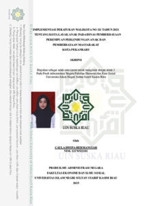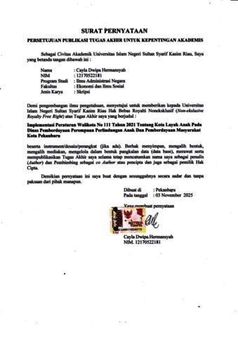 CAYLA DWIPA HERMANSYAH, - (2025) IMPLEMENTASI PERATURAN WALIKOTA NO 111 TAHUN 2021 TENTANG KOTA LAYAK ANAK PADA DINAS PEMBERDAYAAN PEREMPUAN PERLINDUNGAN ANAK DAN PEMBERDAYAAN MASYARAKAT KOTA PEKANBARU. Skripsi thesis, UNIVERSITAS ISLAM NEGRI SULTAN SYARIF KASIM RIAU.