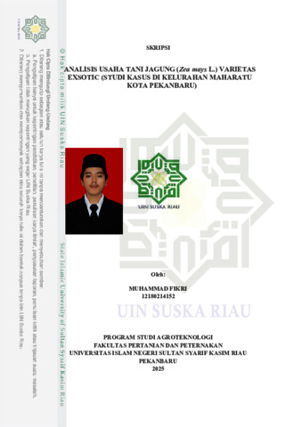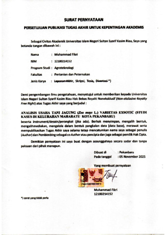 ANALISIS USAHA TANI JAGUNG (Zea mays L.) VARIETAS EXSOTIC (STUDI KASUS DI KELURAHAN MAHARATU KOTA PEKANBARU) Muhammad Fikri (12180214152) Di bawah bimbingan Elfi Rahmadani dan Bakhendri Solfan INTISARI Jagung merupakan komoditas pangan strategis yang memiliki peran penting dalam mendukung ketahanan pangan dan perekonomian nasional. Namun data produktivitas jagung yang terukur belum tersedia sehingga diperlukan analisis usaha tani guna mendukung pengambilan keputusan ditingkat petani Penelitian ini bertujuan untuk menganalisis teknik budi daya, produktivitas, dan efisiensi usaha tani jagung varietas Exsotic di Kelurahan Maharatu, Kecamatan Marpoyan Damai, Kota Pekanbaru. Penelitian dilaksanakan pada bulan April hingga Mei 2025 dengan metode deskriptif kuantitatif. Pengambilan sampel dilakukan secara sensus terhadap 30 petani anggota Kelompok Tani Mustang. Data primer diperoleh melalui wawancara menggunakan kuesioner, sedangkan data sekunder berasal dari instansi terkait. Hasil penelitian menunjukkan bahwa teknik budi daya jagung Exsotic belum sepenuhnya mengikuti pedoman yang dianjurkan oleh Direktorat Jenderal Tanaman Pangan. Total biaya produksi usaha tani jagung adalah Rp 2.238.263/MT, rerata penerimaan sebesar Rp 6.168.333/MT, dan rerata pendapatan sebesar Rp 3.927.887/MT. Nilai efisiensi usaha tani (R/C ratio) mencapai 2,75. Kata kunci: Efisiensi, Jagung, Produktivitas, Usaha Tani, Varietas Exsotic