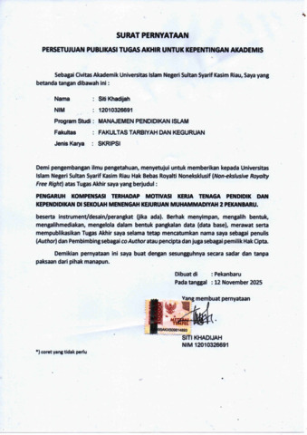 SITI KHODIJAH (2025) PENGARUH KOMPENSASI TERHADAP MOTIVASI KERJA TENAGA PENDIDIK DAN KEPENDIDIKAN DI SEKOLAH MENENGAH KEJURUAN MUHAMMADIYAH 2 PEKANBARU. Skripsi thesis, UNIVERSITAS ISLAM NEGERI SULTAN SYARIF KASIM RIAU.