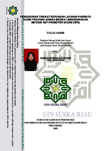 PENGUKURAN TINGKAT KEPUASAN LAYANAN PASIEN DI KLINIK PRATAMA ANNISA MEDIKA I MENGGUNAKAN METODE NET PROMOTER SCORE (NPS) NABILLAH RONAA SUWANDI NIM : 12050223268 Tanggal Sidang : 02 Oktober 2025 Tanggal Wisuda : Program Studi Teknik Industri Fakultas Sains dan Teknologi Universitas Islam Negeri Sultan Syarif Kasim Riau Jl. Soebrantas No.155 Pekanbaru ABSTRAK Kepuasan pasien merupakan faktor yang krusial dalam keberhasilan suatu klinik kesehatan, terutama di era persaingan layanan kesehatan yang ketat. Hasil observasi dan wawancara di Klinik Pratama Annisa Medika I menunjukkan bahwa adanya pasien yang kurang puas, terutama mengenai kecepatan pelayanan dan waktu tungg yang lama. Penelitian ini bertujuan untuk mengukur dan menganalisa tingkat kepuasan layanan pasien di Klinik Pratama Annisa Medika I, serta merancang strategi perbaikan layanan berdasarkan hasi pengukuran. Penelitian ini menggunakan metode Net Promoter Score (NPS) untuk mengukur loyalitas pasien terhadap kepuasan layanan. Hasil dari perhitungan Net Promoter Score (NPS) yaitu menunjukkan nilai 88%. Nilai ini mengidentifikasikan bahwa mayaoritas pasien berada dalam kategori promoter (memberikan skor 9-10). Hal ini berarti sebagian besar pasien merasa puas dengan layanan yang diberikan oleh Klinik Pratama Annisa Medika I dan bersedia untuk merekomendasikan klinik kepada orang lain. Secara keseluruhan, tingkat kepuasan pasien di Klinik Pratama Annisa Medika I sangat baik. Pasien menunjukkan loyalitas tinggi. Meskipun demikian, klinik disarankan untuk terus melakukan evaluasi dan perbaikan berkelanjutan terhdap aspek-aspek pelayanan. Kata Kunci: Kepuasan Layanan, Net Promoter Score (NPS), Kualitas Konsumen, Klinik Pratama