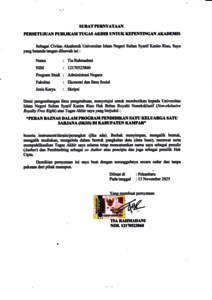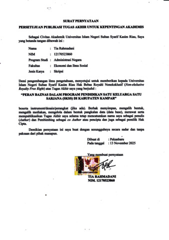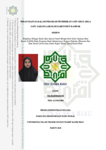ABSTRAK PERAN BAZNAS DALAM PROGRAM PENDIDIKAN SATU KELUARGA SATU SARJANA (SKSS) DI KABUPATEN KAMPAR OLEH: TIA RAHMADANI 12170523860 Penelitian ini bertujuan untuk mengetahui Peran Badan Amil Zakat Nasional (BAZNAS) Dalam Program Pendidikan Satu Keluarga Satu Sarjana (SKSS) Di Kabupaten Kampar, serta mengetahui apa saja hambatan yang di hadapi dalam pelaksanaannya. Metode yang digunakan adalah kualitatif deskriptif dengan teknik pengumpulan data melalui wawancara, observasi, dan dokumentasi. Teori yang digunakan yaitu teori peran dari Soerjono Soekanto yang meliputi peran aktif, peran partisipatif, dan peran pasif. Analisis data menggunakan model Miles dan Huberman yang terdiri dari pengumpulan data, reduksi data, penyajian data, dan penarikan Kesimpulan. Hasil penelitian menunjukkan bahwa peran aktif BAZNAS Kabupaten Kampar tampak dalam pengelolaan program SKSS mulai dari perencanaan, proses seleksi, penyaluran dana, hingga pengawasan terhadap penerima manfaat. Peran Partisipatif terlihat dari sinergi dengan pemerintah daerah, perguruan tinggi, masyarakat sebagai mustahiq, serta mahasiswa penerima beasiswa. Namun demikian, BAZNAS Kabupaten Kampar juga menghadapi hambatan, antara lain keterbatasan dana zakat yang terhimpun, minimnya sumber daya manusia (SDM), sistem administrasi manual, koordinasi antar lembaga yang belum optimal, rendahnya kesadaran masyarakat dalam menyalurkan zakat melalui BAZNAS, serta ketergantungan penuh pada aturan syariat dan prosedur administrasi. Kata Kunci: Peran, BAZNAS, SKSS