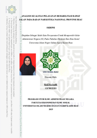 ABSTRAK ANALISIS KUALITAS PELAYANAN REHABILITASI RAWAT JALAN PADA BADAN NARKOTIKA NASIONAL PROVINSI RIAU OLEH : RATNA SARI 12170522251 Kualitas pelayanan rehabilitasi rawat jalan merupakan faktor penting dalam keberhasilan pemulihan pecandu narkotika. Badan Narkotika Nasional Provinsi (BNNP) Riau sebagai institusi pemerintah yang menangani rehabilitasi narkoba perlu mengevaluasi kualitas pelayanannya untuk memastikan efektivitas program rehabilitasi rawat jalan. Penelitian ini bertujuan menganalisis kualitas pelayanan rehabilitasi rawat jalan di BNNP Riau berdasarkan lima dimensi kualitas layanan (Reliability, Responsiveness, Assurance, Empathy, dan Tangibles). Penelitian menggunakan pendekatan kualitatif dengan metode wawancara mendalam terhadap 13 narasumber yang terdiri dari staf administrasi BNNP Riau, klien rehabilitasi aktif, dan klien pasca rehabilitasi. Analisis data menggunakan teknik reduksi data, penyajian data, dan penarikan kesimpulan. Hasil penelitian menunjukkan bahwa pelaksanaan rehabilitasi bagi penyalahguna narkotika di BNNP Riau telah berjalan efektif sesuai prosedur rehabilitasi dan kode etik, serta berdasarkan kepuasan pasien rehabilitasi terhadap layanan. Meskipun demikian, program rehabilitasi masih menghadapi beberapa tantangan. Dimensi empathy dan tangibles menunjukkan kinerja yang relatif baik, sementara dimensi reliability, responsiveness, dan assurance masih memerlukan perbaikan signifikan, terutama terkait keterbatasan SDM, sistem informasi, dan infrastruktur. Prioritas perbaikan harus diberikan pada penambahan tenaga profesional terlatih, pengembangan sistem informasi terintegrasi, dan peningkatan kontinuitas layanan pasca rehabilitasi.