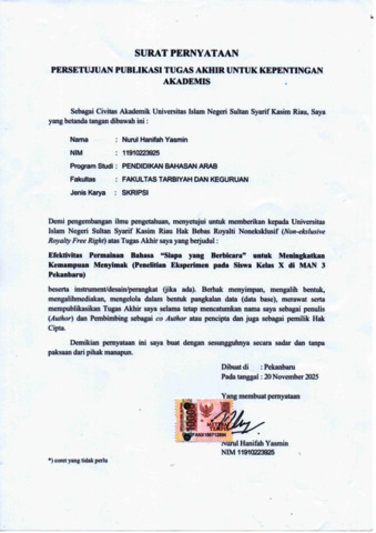 NURUL HANIFAH YASMIN, - (2025) EFEKTIVITAS PERMAINAN BAHASA “SIAPA YANG BERBICARA” UNTUK MENINGKATKAN KETERAMPILAN MENYIMAK (PENELITIAN EKSPERIMEN PADA SISWA KELAS X DI MAN 3 PEKANBARU). Skripsi thesis, Universitas Islam Negeri Sultan Syarif Kasim Riau.