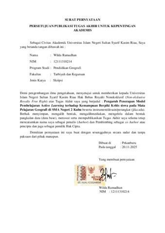 WILDA RAMADHAN, - (2025) PENGARUH PENERAPAN MODEL PEMBELAJARAN ACTIVE LEARNING TERHADAP KEMAMPUAN BERPIKIR KRITIS SISWA PADA MATA PELAJARAN GEOGRAFI DI SEKOLAH MENENGAH ATAS NEGERI 2 KUBU. Skripsi thesis, Universitas Islam Negeri Sultan Syarif Kasim Riau.