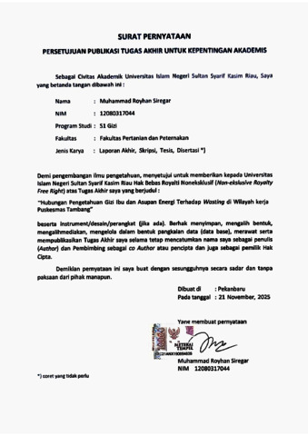 MUHAMMAD ROYHAN SIREGAR, - (2025) HUBUNGAN PENGETAHUAN GIZIIBU DAN ASUPAN ENERGI TERHADAP WASTING DI WILAYAH KERJA PUSKESMAS TAMBANG. Skripsi thesis, Universitas Islam Negeri Sultan Syarif Kasim Riau.