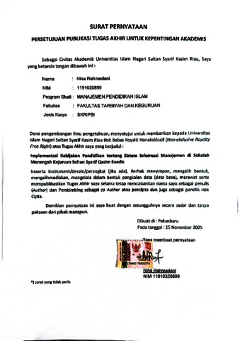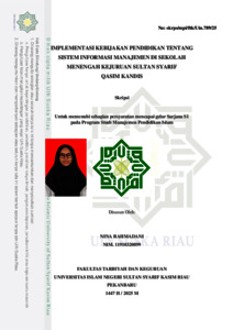 NINA RAHMADANI, - (2025) IMPLEMENTASI KEBIJAKAN PENDIDIKAN TENTANG SISTEM INFORMASI MANAJEMEN DI SEKOLAH MENENGAH KEJURUAN SULTAN SYARIF QASIM KANDIS. Skripsi thesis, Universitas Islam Negeri Sultan Syarif Kasim Riau.