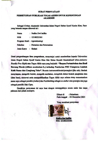 NADIRA DWI INDIKA, - (2025) RESPON PERTUMBUHAN DAN HASIL BAWANG MERAH (Allium ascalonicum L.) TERHADAP PEMBERIAN POC CAMPURAN LIMBAH KULIT NANAS DAN CANGKANG TELUR. Skripsi thesis, UNIVERSITAS ISLAM NEGRI SULTAN SYARIF KASIM RIAU.
