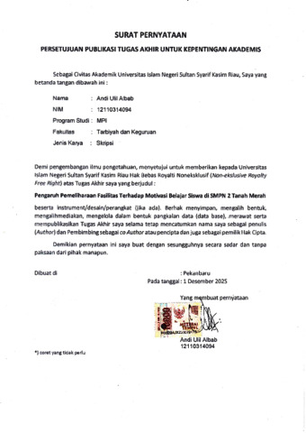 ANDI ULIL ALBAB, - (2025) PENGARUH PEMELIHARAAN FASILITAS TERHADAP MOTIVASI BELAJAR SISWA DI SMPN 2 TANAH MERAH. Skripsi thesis, Universitas Islam Negeri Sultan Syarif Kasim Riau.