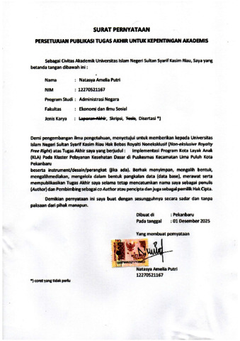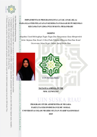 NATASYA AMELIA PUTRI, - (2025) IMPLEMENTASI PROGRAM KOTA LAYAK ANAK (KLA) PADA KLASTER PELAYANAN KESEHATAN DASAR DI PUSKESMAS KECAMATAN LIMA PULUH KOTA PEKANBARU. Skripsi thesis, Universitas Islam Negeri Sultan Syarif Kasim Riau.