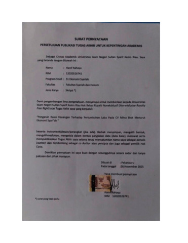 HANIF RAHAYU, - (2025) PENGARUH RASIO KEUANGAN TERHADAP PERTUMBUHAN LABA PADA CV MITRA BLOK MENURUT EKONOMI SYARIAH. Skripsi thesis, Universitas Islam Negeri Sultan Syarif Kasim Riau.