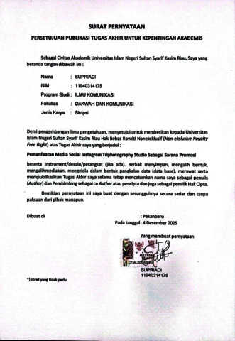 SUPRIADI, - (2025) PEMANFAATAN MEDIA SOSIAL INSTAGRAM TRIPHOTOGRAPHY STUDIO SEBAGAI SARANA PROMOSI. Skripsi thesis, Universitas Islam Negeri Sultan Syarif Kasim Riau.