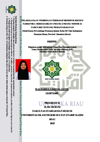 WALFADILLA DESVIA G, - (2025) PELAKSANAAN PEMBINAAN TERHASAP RESIDIVIS KHUSUS NARKOTIKA BERDASARKAN UNDANG-UNDANG NOMOR 22 TAHUN 2022 TENTANG PEMASYARAKATAN (STUDI KASUS DI LEMBAGA PEMASYARAKATAN KELAS III TALU KABUPATEN PASAMAN BARAT,PROVINSI SUMATERA BARAT). Skripsi thesis, Universitas Islam Negeri Sultan Syarif Kasim Riau.