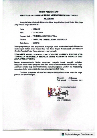 ARIYANI, - (2025) PENGARUH MODEL PEMBELAJARAN CREATIVE PROBLEM SOLVING (CPS) TERHADAP KEMAMPUAN BERPIKIR KRITIS MATEMATIS DITINJAU DARI SELF EFFICACY SISWA. Skripsi thesis, Universitas Islam Negeri Sultan Syarif Kasim Riau.