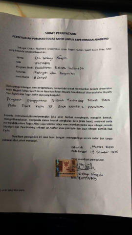 ELA WAHYU NINGSIH, - (2025) PENGARUH PENGGUNAAN E-BOOK TERHADAP MINAT BACA PADA SISWA KELAS XII SMA NEGERI 2 PEKANBARU. Skripsi thesis, Universitas Islam Negeri Sultan Syarif Kasim Riau.