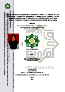DINA LORENZA SIREGAR, - (2025) IMPLEMENTASI FUNGSI BADAN PERMUSYAWARATAN DESAN DALAM PENYALURAN ASPIRASI MASYRAKAT BERDASARKAN PERATURAN DAERAH LABUHANBATU SELATAN NO. 2 TAHUN 2019 TENTANG BADAN PERMUSYAWARATAN DESA DI DESA PERK SEI RUMBIA. Skripsi thesis, Universitas Islam Negeri Sultan Syarif Kasim Riau.