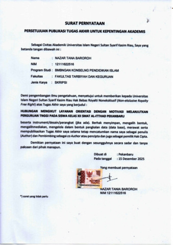 NAZAR TANIA BAROROH, - (2025) HUBUNGAN MENGIKUTI LAYANAN ORIENTASI KARIER DENGAN MOTIVASI MELANJUTKAN PERGURUAN TINGGI PADA SISWA KELAS XII SMAIT AL-ITTIHAD PEKANBARU. Skripsi thesis, Universitas Islam Negeri Sultan Syarif Kasim Riau.