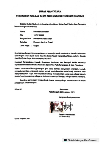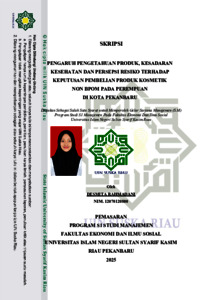 DESMITA RAHMADANI, - (2025) PENGARUH PENGETAHUAN PRODUK, KESADARAN KESEHATAN DAN PERSEPSI RESIKO TERHADAP KEPUTUSAN PEMBELIAN PRODUK KOSMETIK NON BPOM PADA PEREMPUAN DI KOTA PEKANBARU. Skripsi thesis, Universitas Islam Negeri Sultan Syarif Kasim Riau.