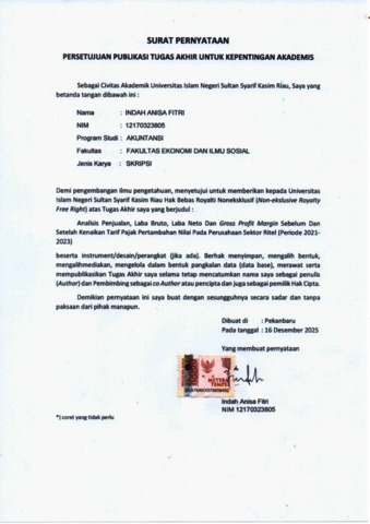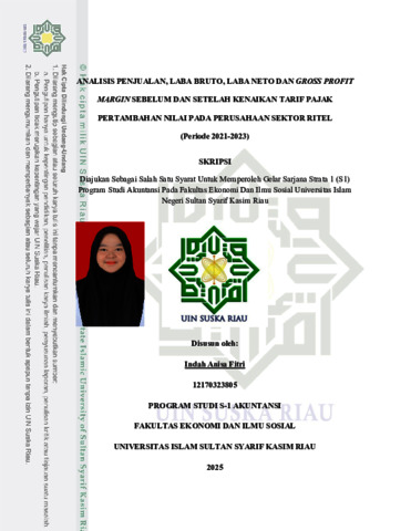 INDAH ANISA FITRI, - (2025) ANALISIS PENJUALAN, LABA BRUTO, LABA NETO DAN GROSS PROFIT MARGIN SEBELUM DAN SETELAH KENAIKAN TARIF PAJAK PERTAMBAHAN NILAI PADA PERUSAHAAN SEKTOR RITEL (PERIODE 2021-2023). Skripsi thesis, Universitas Islam Negeri Sultan Syarif Kasim Riau.
