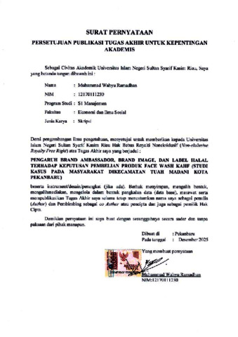 MUHAMMAD WAHYU RAMADHAN, - (2025) PENGARUH BRAND AMBASSADOR, BRAND IMAGE, DAN LABEL HALAL TERHADAP KEPUTUSAN PEMBELIAN PRODUK FACE WASH KAHF (STUDI KASUS PADA MASYARAKAT KECAMATAN TUAH MADANI KOTA PEKANBARU). Skripsi thesis, Universitas Islam Negeri Sultan Syarif Kasim Riau.