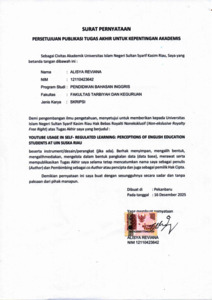 ALISYA REVIANA, - (2025) YOUTUBE USAGE IN SELF- REGULATED LEARNING: PERCEPTIONS OF ENGLISH EDUCATION STUDENTS AT UIN SUSKA RIAU. Skripsi thesis, Universitas Islam Negeri Sultan Syarif Kasim Riau.