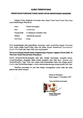 RADIAN PAMUNGKAS, - (2025) MANAJEMEN KEPALA SEKOLAH DALAM PENGEMBANGAN PROGRAM UNGGULAN PESERTA DIDIK DI MADRASAH ALIYAH DINIYAH PUTERI PEKANBARU. Skripsi thesis, Universitas Islam Negeri Sultan Syarif Kasim Riau.